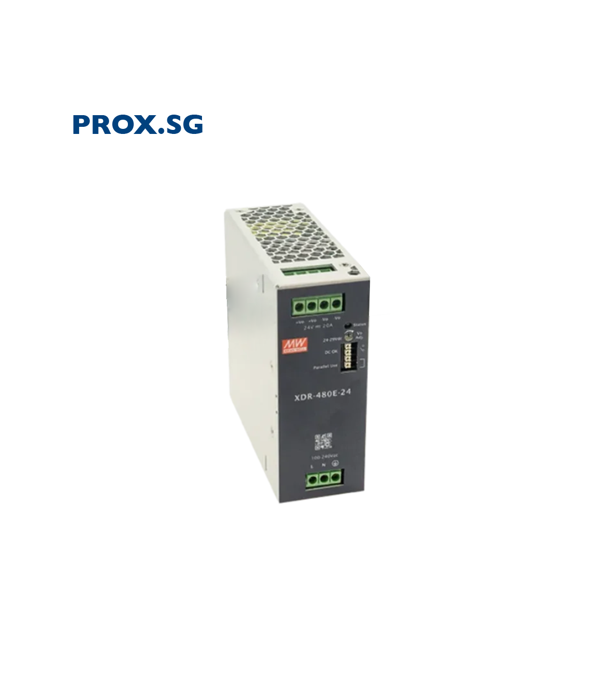 The XDR-480E-24 delivers 480W of reliable 24V DC power in a slim DIN rail design. It features universal AC input (85–264VAC), high efficiency up to 95%, and a fanless design for quiet, long-lasting operation. Includes a DC OK signal, and operates in harsh environments from -40°C to +70°C (with derating above 50°C).